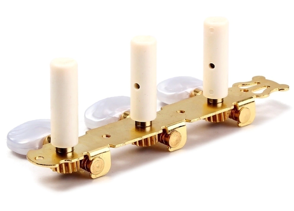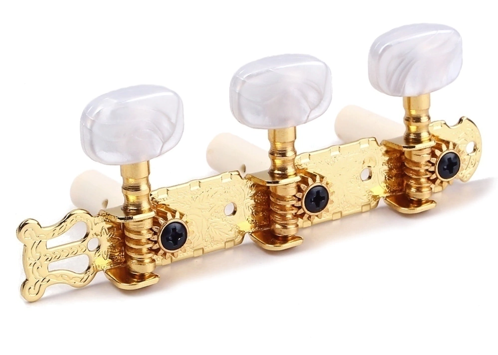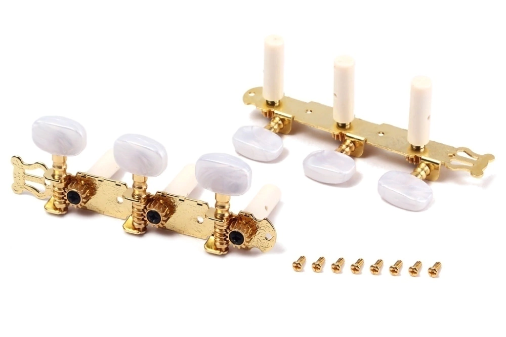 Jogo de tarraxas para violão- Tipo: pino grosso.- Botões lisos: plástico injetado com acabamento semelhante à madrepérola.- Material:metal.- Acabamento:dourado.- Dimensões: quinta foto do anúncio.- Origem:importado.- Alta qualidade e excelente durabilidade.Ideal para violões de Náilon.