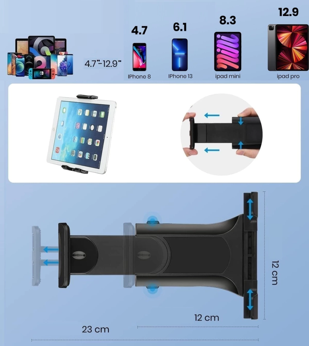 - Acomoda dispositivos de 4,7 a 12,9" com segurança.