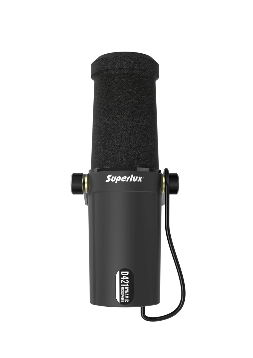 O Superlux D421 é um microfone dinâmico de excelente desempenho, possui uma resposta de frequência plana e ampla, com som natural, claro e realista, é adequado para estúdios de broadcasting, vocais e gravação. Ao mesmo tempo, o design anti-eletromagnético especial é adotado, o que pode isolar efetivamente a interferência eletromagnética gerada pelo computador e a tela, e pode efetivamente reduzir o ruído mecânico.